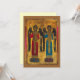 mittelalterliche Ikonenmalerei von zwei Engeln, michael und gabriel auf Engel in rotem Mantel, und die andere in einem roten Mantel, verzierte goldene Schattierungen überquerten die Brust und goldene verzierte Schnitte am Ende der Garderobe, dunkelbraune Flügel, halten ein Personal und halten ein rundes Objekt in ihren Händen, mit dem Hintergrund gefüllt mit metallischem goldenen Blatt glänzenden und einem leuchtenden und leuchtenden mittelalterlichen und einem mittelalterlichen christlichen Bild. blau, rot und gold mit einem Mustereffekt.