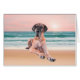 Niedlicher Großer Dane Hund sitzt am Strand. Fügen Sie den Namen oder einen beliebigen Text gemäß Ihren Anforderungen hinzu.