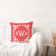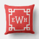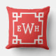 Das stilvolle und moderne Kissendesign mit quadratischem Akzent zeichnet sich durch ein griechisches geometrisches Rahmendesign und ein personalisiertes Monogramm aus. Korallenfarben rot und weiß. Die Hintergrundfarbe kann geändert werden.