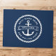 Türmatte mit einem Anker mit einem Bandbanner darüber mit anpassbarem Text "welcome". Fügen Sie Ihren Bootsnamen oben und den Hafen unten hinzu. Um den Anker und den Text ist ein runder Seilstreifen. Weißes Design auf dunkelblauem Hintergrund.