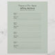 Diese 8,5" x 11" Klebebinder-Füllseite, in hellgrau-grün mit schwarzer Schrift, ist personalisiert und perfekt zum Füllen binderartiger Memorial Books oder Gästebüchern. Dieses Notizbuch-Einfüllpapier ist leicht zu personalisieren - geben Sie Ihre eigene Stimmung aus, ändern Sie den Namen, löschen oder ändern Sie Daten. Seite ist vorformatiert, damit die Teilnehmer ihre Kontaktinformationen und eine Nachricht beim Anmelden hinzufügen können, 4 Namen pro Seite. Sie müssen Löcher durchstechen, um auf Ihren Binder zu passen. Alle Rechte vorbehalten © 2014 Alan & Marcia Socolik