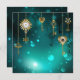 Gold, antike Schlüssel mit Gängen und Dials hängen an goldenen Ketten auf leuchtend grünem Hintergrund.