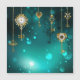 Gold, antike Schlüssel mit Gängen und Dials hängen an goldenen Ketten auf leuchtend grünem Hintergrund.