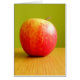Karte mit Foto aus rotem Apfel auf hellem Holztisch mit leuchtend kalk-grünem Hintergrund.