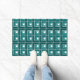 Diese Türmatte hat ein geometrisches Design aus Ls in aquamarinen Farbtönen, die in verschiedenen Richtungen angeordnet sind und sich durch das Design wiederholen.