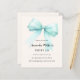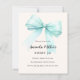 Ein zartes beige, cremefarbenes Dekor, das mit einem großen, aquamarinen, hellgrünen Bogen geschmückt ist. Personalisieren und fügen Sie einen Namen und Party-Details hinzu. 1 Blatt = 1 Einladung mit Druckkante bis Kante.