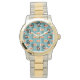 Die Armbanduhr dieser Männer hat ein modernes Design aus fünf aquamarinen Linien und zwei orangefarbenen Rechtecken, die sich im Design wiederholen.