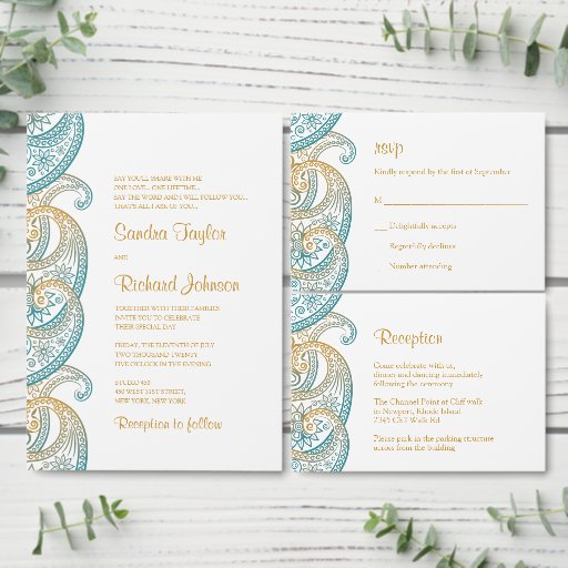 Indian Wedding Invitations Paisley, Teal and GoldDesignt von Galina Ivanova
