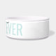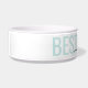 Aquamarine Aqua türkisblaugrüne Hundeschüssel mit grauem "BEST DOG EVER" und dem Hundenamen in einem schicken und eleganten Kalligraphie-Script-Schriftart-Textüberlagern. Geben Sie jeden personalisierten Text ein, den Sie für den Hintergrund und die oberste Textebene wünschen, um Ihre eigene personalisierte moderne und minimale und lustige Keramik Heimtierfutter oder Wasserschüssel zu erstellen. Sehen Sie sich unsere Sammlung von koordinierenden Schüsseln und erhalten Sie ein Set!