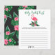 Das Design der Baby-Dusche ist mit rosa Flamingo mit üppig grünen Palmenblättern und tropischen Hibiskus-Blume ausgestattet. "Aloha Baby" Ein tropisches Blumenmuster mit schwarzer Hintergrundfarbe zieht die Rückseite der Karte hoch.