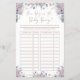 Elegantes Babyduschenspielblatt für das Baby Bump Guess Game mit wunderschönen Aquarell-Wildblume Blumensträuße in den Tönen lila, violett, lila, rot, pfirsichblau, staubblau und Grüntöne mit einem Rose Goldtext, der personalisiert sein kann. Der Titel HOW BIG IS THE BABY BUMP ist in einem modernen, eleganten, handgeschriebenen Skript-Schriftart. Kontaktieren Sie den Designer über den Zazzle Chat oder makeitaboutyoustore@gmail.com , wenn Sie dieses Design modifizieren möchten, ein anderes Produkt erwerben möchten oder gerne Artikel koordinieren möchten.
