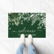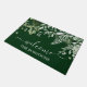 Familie Name Wasserfarbe Botanische Vegetation Willkommen Doormat umfasst Efeu, Farn und Salbei Blätter. Waldgrüner Hintergrund.