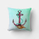 Ein Kissen zum Thema Wassersport. Der Hintergrund ist eine ätherische Aqua-grüne Farbe. Ein cooles maritimes Design mit rosa und grünem Anker mit Seil und Muschel, mit Aquarellfarben.