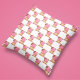 Ein charmantes Kissendesign, das rosa Vanillekuchen mit Schokoladenkeksen, umgeben von SchokoladenkBonbons und farbenfrohen Akzenten zeigt.