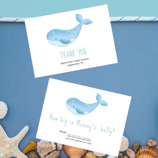 Ein kleines Stück unterwegs mit dieser Babydusche unter dem Thema Meer, mit Babywal in sanften, blauen Aquarellen.