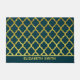 Marokkanischer arabesque Quatrefoliendruck in Imitaten Gold auf dunkelzyprischen Blau (grünblauer Schatten). Farbtöne aus goldgelbem Gelb zur Simulation von Farbe, Textur und Glanz aus metallischem Hammergold oder Goldblatt. Personalisieren Sie mit Ihrem Namen oder Ihrer Nachricht in goldgelben Sans Schriftart Set auf einem blauen und goldenen Streifen am unteren Ende des Produkts.