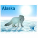 Weiß auf Weiß. Eine 10-Nugget-Porto-Briefmarke, herausgegeben von einer mythischen unabhängigen Nation von Alaska. Ein digitales Bild eines arktischen Fox, Vulpes lagopus, auf dem Polareis. Die Sonne hängt tief im hellblauen arktischen Himmel. Nicht an der Sonne starren, da es Ihren Augen schaden kann. Textlesen, "Alaska", "POSTAGE 10 NUGGETS", "Arctic Fox" und "Vulpes lagopus" erscheinen ebenfalls. Der Arktische Fox ist in tiefer Kälte bequem; er fängt nicht an zu zittern, bis die Temperaturen aufgrund seines dichten, vielschichtigen Fells auf etwa -70 °C (-94 °F) fallen. Weitere Anpassungen an ein kühles Klima sind Fell auf den Fußsohlen, kurze Ohren und ein kurzes Maultier. Arktische Füchse leben in Pfahlen, in einem Blizzard können sie sich in den Schnee stürzen, um Unterschlupf zu schaffen. Das Fell des arktischen Fuchses, manchmal blau-grau, ist eine sehr effektive Wintertarnung. Die natürlichen Farbtöne ermöglichen es dem Tier, sich in die Umwelt zu integrieren. Während der kurzen warmen Jahreszeit wechselt ihr Fell zu braun oder grau, wieder Schauspiel als Tarnung in Tundra-Felsen und Pflanze. Im Winter, wenn die Beute knapp ist, folgen die Füchse der Jagd auf Polarbären auf der Eispackung, die auf Schrott füttre. Während des Sommers fressen Nagetiere, Vögel, Eier und sogar Fische. Sie werden auch auf Beeren und Algen gefüttert. Arktische Füchse haben ein sehr scharfes Gehör, unterstützt von ihren breiten, nach vorne gerichteten Ohren, die es ihnen ermöglichen, die genaue Position ihrer Beute unter dem Schnee zu finden. Wenn es etwas unter dem Schnee bewegen hört, springt es in die Luft und springt durch den Schnee, um seine Beute zu fangen. Der Bereich der arktischen Füchse ist umpolar; er ist im ganzen Norden zu finden. Das einzige in Island geborene Landtier erreichte es, indem es am Ende der letzten Eiszeit über dem Eis spazierte.