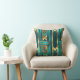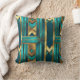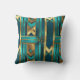 This throw pillow features an art deco style geometric pattern in simulated gold and turquoise.