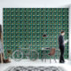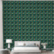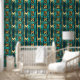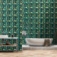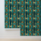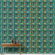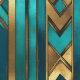 This wallpaper features an art deco geometric pattern with arrows in simulated gold and turquoise for an elegant look.