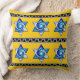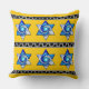 Und ein heller, sonniger "Guten Morgen" für Sie! Das ist die Botschaft, mit der Sie empfangen werden, wenn Sie tränenweise durch das Wohnzimmer gehen, um zu kochen und Ihre Augen auf diesem extra plumpen, extra kuscheligen, besonders glücklich aussehenden Kissen mit Leslie Sigal Javorek's original lebensecht blauen und weißen Buntglasstern Star of David laufen lassen; in 2 Reihen von 3 Sternen, getrennt durch Streifen eines silbrigen Schlüsselmusters auf Schwarz & Set heller Taxigelber Hintergrund. Auf der Rückseite ist das selbe Gelb von selbst.