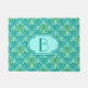 Digitale Reproduktion eines klassischen Art Deco Ventilatormusters Türmatte mit Monogramm - Türkis / Pfauenblau auf blassem Wasser, verziert mit Gold