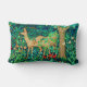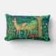 Kissen aus Lumbar in einem Jugendstil-Wandteppich, das Hirsche in einem fantastischen Waldambiente entworfen hat - hellgesprenkeltes Hirsch in einem üppig blauen und grünen Hintergrund von Blätter und Blume, mit roten Tulpen versehen
