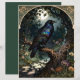 A raven with fantastic, irridescent feathers perches in a gnarled tree under a full moon. An art nouveau arch frames the scene. The back is plain dark green, without an image or texture. Beautiful, Gothic image.