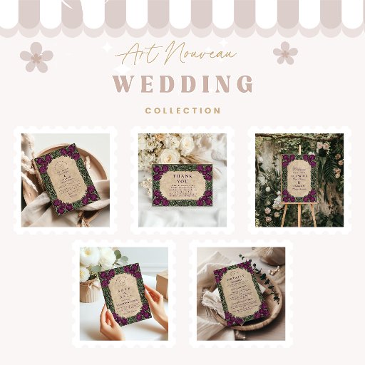 Feiern Sie mit diesem gewagten Jugendstil-Hochzeitsdesign im zeitlosen Stil. Mit tiefen, lila Dicken, die in fließende grüne Weinberge eingebettet sind, schafft die faszinierende Grenze einen dramatischen und eleganten Rahmen mit Vintagem Charme. Ideal für Paare, die die Natur, keltische Symbolik oder ein einzigartiges botanisches Kunstwerk Liebe haben, fügt dieses Design Ihrer Hochzeitsfeier eine Touch von Eleganz und Individualität hinzu. Vollständig anpassbar mit Ihren Daten.