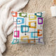 Dieses Kissen hat ein Design von Rechtecken, die sich an einem Ende in groben Farbtönen, orange, grün, aquamarin, lila, blau, rosa und gelb mit atomaren Linien ausstrecken.