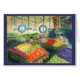 Zwei produzieren die Händler sorgfältig stapeln und arrangieren das farbenfrohe Obst & Gemüse in ihrem Stall. Zwei Sets Waage hängen in Harmonie mit den Figuren. Ausgerendert in Acryl und Pastellfarben auf Papier.
