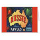 Aussie Apples aus Tasmania ist ein Vintages Fruchtkäseletikett aus dem Jahr 1933 . Eine Karte Australiens in der Mitte mit roten und grünen Äpfeln.