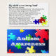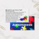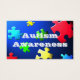 Visitenkarte mit einigen grundlegenden Informationen über ASD "Autismus ist eine komplexe neurologische Störung..."Diese Trommeln können beängstigend sein, zu beobachten. Das Kind versucht zu kommunizieren......" Rückwärts der Karte hat das Bild von zerfallenden Puzzleteilen vor einem hinterleuchteten blauen Hintergrund. Diese Karten können nützlich sein, wenn ein Elternteil versucht, das Verhalten des Kindes zu verwalten, und Wecker sind Ansammlung und/oder Kommentar.
