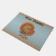 This outdoor welcome door mat is light blue with orange top and bottom borders and and an Autumn coloured male turkey with fanned tail standing in Fall leaves. Customise your text with the template.