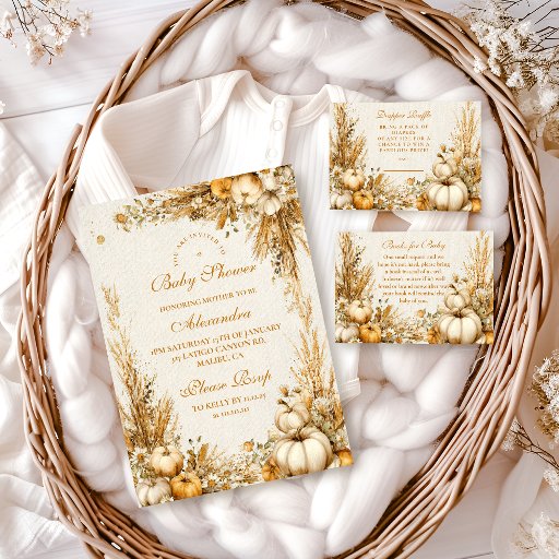 Mit diesem rustikalen Babyduschdesign lassen Sie den Charme des Herbstes zu Ihrem Fest werden. Mit cremefarbenen Kürbissen, getrocknetem Weizen und weichen Herbstfloralen schafft es eine gemütliche Landschaft, die sich perfekt für Bauernhäuser oder saisonale Ansammlungen eignet.