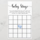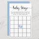 Niedliches preiswertes Spiel für Ihre Baby Boy Dusche mit "baby bingo" in einem stilvollen Drehbuch mit Wimpern und einer pastellblauen Aquarellfarbe von Babyfüßen in der Mitte des Brettes.