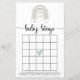Niedliches Baby Bingo Duschspiel mit abstrakter boho Wasserfarbe eines schluchgrünen, orangefarbenen und lavendelfarbenen Regenbogens mit Herz und "Baby Bingo" in einem stilvollen Drehbuch mit Schluckauf.