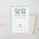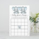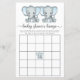 Niedliches Bingo Duschspiel mit "Baby Dusche Bingo" in einem stylischen, weich grauen Drehbuch mit Wimpern und einer pastellblauen Aquarellfarbe von Zwillingsjungen Elefanten.