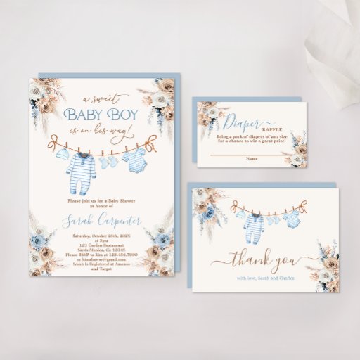 Baby Boy Clothes Kinderdusche Einladung, Blue pampas boho Junge Einladung