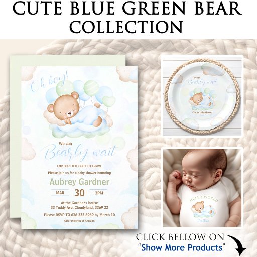 Neugeborener Baby Boy Personalisierter blaugrüner Bärenanzug. Die sanften Pastellblau, Grün und Beige mit einem niedlichen Baby-Bärenjungen auf den Wolken sind für einen Neugeborenen einfach so reizend. Personalisieren Sie den Text einfach. Kate Eden Art