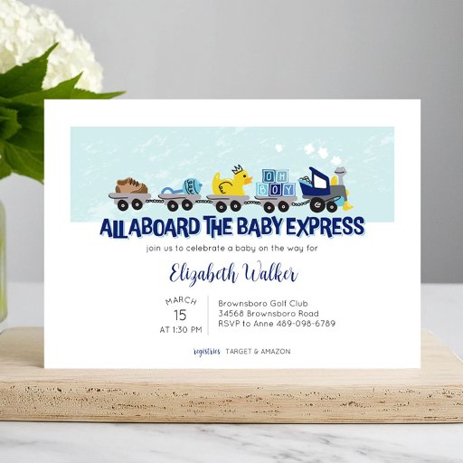 Eine niedliche Duscheinladung mit der Überschrift "All Abard the Baby Express" perfekt für eine Babydusche zum Thema Bahn. Design bietet eine niedliche Zugführung Babyartikel Abbildung. Dieses typografisch angetriebene Design ist sehr einfach zu anpassen, mit der Vorlage zur Verfügung gestellt. Präfekt zum Set das Thema für Ihre Babydusche feiern.