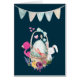 Eine Babydusche/Babydusche-Begrüßungskarte mit einem Banner, der über einer niedlichen Aquarell-Abbildung eines Eis in einem Korbkorb aufgehängt ist. Mit Bändern, Bögen, Blume und kleinen Herzen dekoriert. Ein rosa Flamingo und ein weißes Hasen sitzen auf beiden Seiten geduldig für den großen Tag gewartet. Die Innenseite der Karte hat einen Banner und eine personalisierte Nachricht.