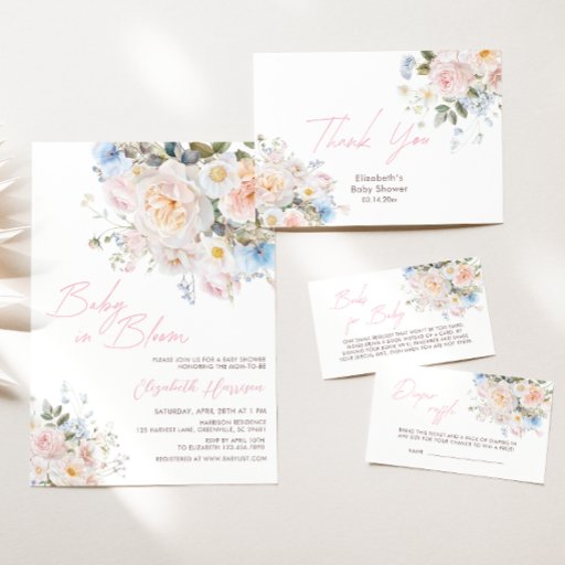 Dieses Design besticht durch delikate Aquarellbäume und Rose in einer atemberaubenden Farbpalette aus staubblauen, hellrosa und weißen Farbtönen. Freuen Sie sich auf ein sanftes und elegantes Aussehen Ihrer Babydusche "Baby in Bloom".