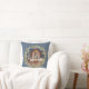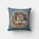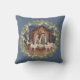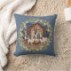 Dieses traditionelle Weihnachtskissen zeigt ein Krippenbild des Jesusbabys, das in einem Manöver mit Maria und Joseph in der Mitte schläft. Die Krippe ist von einem Kranz mit weißen Beeren umgeben. Der Hintergrund hat eine koordinierende blaue Farbe.