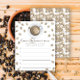Wasserfarbene Kaffeebohnen und Tasse Kaffee und Bohnen Muster. Kaffee brauende Babydusche. Kaffeemaschine mit Babydusche. Text mit Kaffee-Ring und mit Kaffeebohnen und Tasse Kaffee.