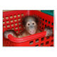 Kleiner Säugling Alfred blickt heraus von seinem Wäschereikorb "Schlafennest" im Kinderzimmerabschnitt für verwaiste Orang-Utans auf der Insel von Borneo. Lernen Sie seine Geschichte und die der Tausenden anderer Rettungen im IMAX Film ", der geboren ist, wild zu sein"