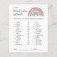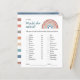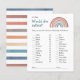 Herrliche Aquarellfarbe zeichnend durch Suki's eines boho Regenbogen in blau, aquamarin terra-cotta, beige grau und braun. Fröhlicher und lustiger Schriftart aquamarin für "Würden sie lieber Spieltitel und Kohle für zusätzliche Babydusche Details und Anleitungen. Die Rückseite des Babyduschspiels ist mit einem Aquarellstreifen in den gleichen Bohfarben wie der Regenbogen vorne ausgestattet. Design ist Teil der Boho Retro Baby Shower Party Supplies and Gifts Collection, die Einladungen für Babyduschen, Windelraffen und Bücherregale, Party, Dekoration und Geschenke für Neugeborene beinhaltet.