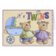 Ein Baby und ein byby Mädchen tragen mit einem Kinderwagen, zur Ankunft der Doppelbabys zu beglückwünschen. Die bunten wordart Sets es weg, "ich" "in den Zwillingen" bin ein Babygeklapper! Dieses konnte auch verwendet werden da eine Karte, um die Geburt von zwei wunderbaren Babys anzukündigen.