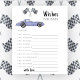 Race Car Thema Baby Dusche Einladungskarte mit Aquarellbildern eines lila (violetten) Vintage Autos und schwarz - weiß Rennen Flagge. "Renn um eine Babydusche."