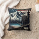 Ein majestätischer Glatzadler liegt auf einem Ast in der Nähe eines Bergsees, umgeben von immergrünen Bäumen und einer Kulisse aus roten, weißen und blauen Streifen.