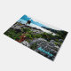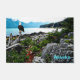 Ein digitales Gemälde eines Glatzenadlers, der auf einem Treibholzholz steht und an der felsigen Küste von Alaska gespült wird; in der Ferne lauern die Berge. Es erscheint auch der Text "Alaska" mit individualisierbarem Text.